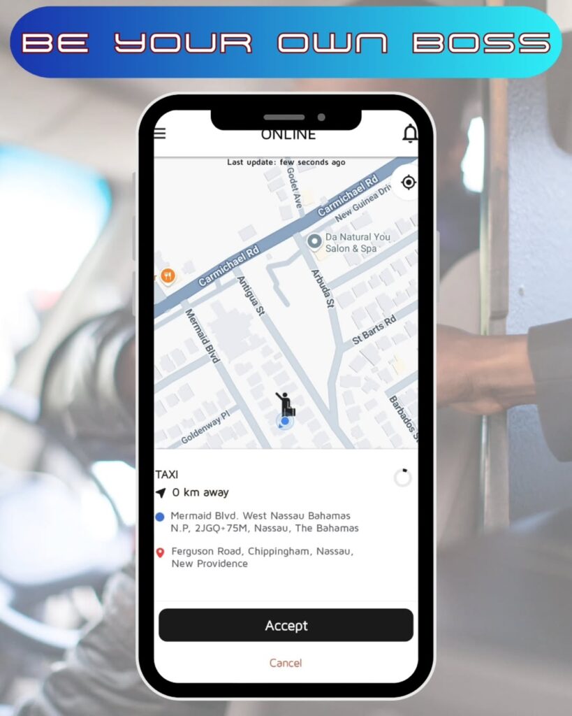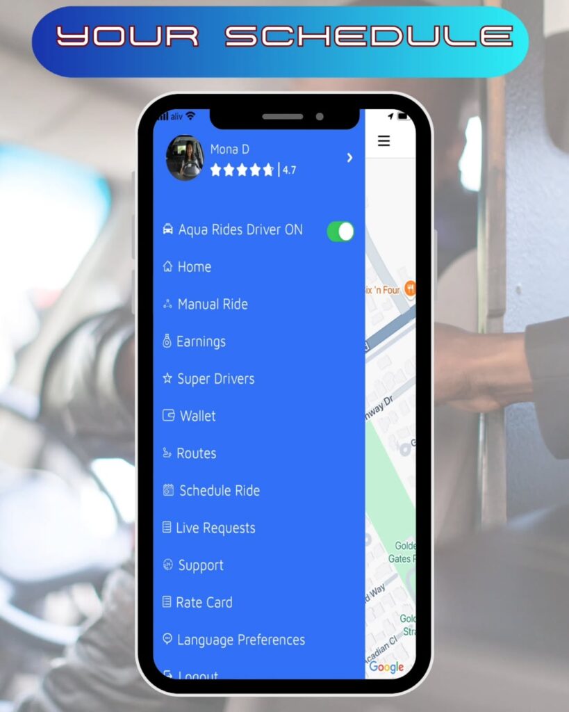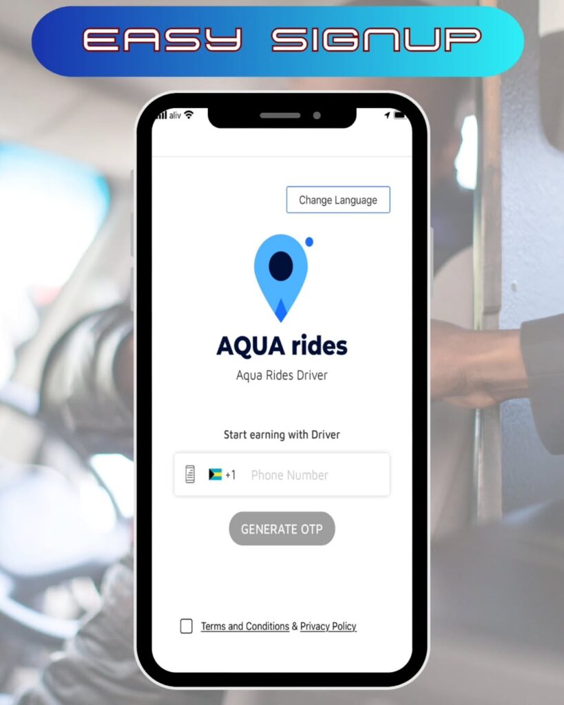 Download the FREE AQUA rides Driver App from the Google Play or App Store on your smartphone. Use your phone number to create an account.